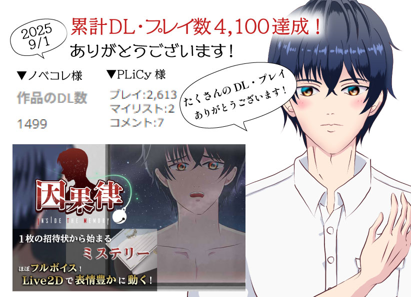 2025.8.1、ミステリーノベルゲーム「因果律 Inside The Memory」が累計DL・プレイ数4100を達成しました!