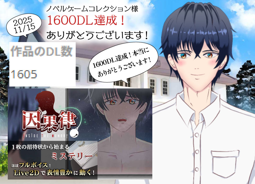 去る2025.11.15、ミステリーノベルゲーム「因果律 Inside The Memory」がノベルゲームコレクション様にて1600DLを達成しました!